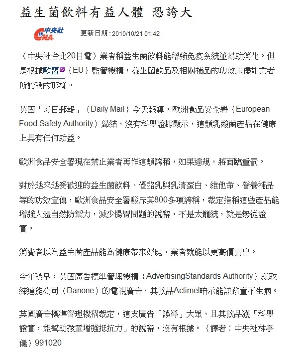 > 益生菌飲料有益人體 恐誇大!
