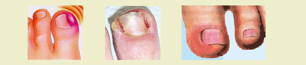 在使用殺菌劑(如:1﹪或2﹪的來多卡因)後,以無菌剪刀快速滑過嵌入的趾甲下方。 |