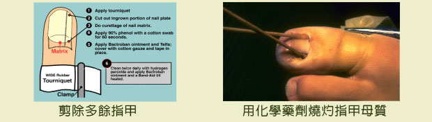 以無菌剪刀刺入受壓迫的點,剪開並移除患處趾甲。同時移除此部位不良的組織。且保持潮濕殺菌狀態,直至發炎的狀況消退。 |